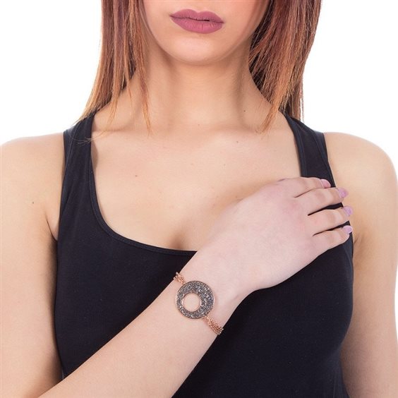 Bracciale doppio filo in bronzo placcato oro rosa con centrale in Swarovski crystal rock metallic silver. Lunghezza cm 15,5, estendibile fino a cm 21.