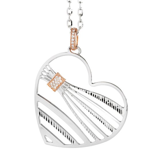 Collana con pendente a cuore fiocco diamantato, con nodo placcato in oro rosa e zirconi bianchi. diametro cuore cm.4.2. Lunghezza catena cm. 45 accorciabile grazie ad anellini finali.