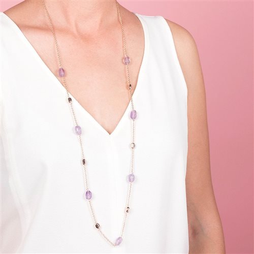 Un'irresistibile collana con pietra ametista lunga, realizzata nell'inimitabile Golden Rose, placcata oro rosa 18 kt con pepite lucide color rosa e pietre lisce, dalla forma materica e spontanea: un fascino vibrante e naturale, nelle tipiche e ricercate sfumature lilla trasparenti; un taglio semplice e raffinato che sottolinea le caratteristiche naturali di questa pietra. L'incontro tra la migliore manitfattura, e la meticolosa attenzione del Made in Italy con un design originale a cura del nostro Atelier e selezionate materie prime per un gioiello che sarà protagonista dei tuoi look e facile da abbinare: trova l'anello che preferisci tra i nostri solitari e anelli cocktail con pietre e ametista, abbinala al bracciale e agli orecchino coordinati o semplicemente a altre collane lunghe per uno stile personalissimo e originale, interamente nickel e cadmium free e facile da portare. - Code: WSBZ00057 Golden Rosè(R): nuova lega nobile lucente e di color rosa già nel suo stato naturale, resistente ai graffi , realizzata con una formula brevettata che impedisce che cambi colore nel tempo. Placcatura in Oro Rosa 18kt Colore lucente nel tempo e maggiormente resistente ai graffi Manifattura e produzione 100% made in Italy Pietre naturali certificate selezionate a mano Tutti i gioielli Bronzallure sono ipoallergenici, cadmium e nichel free.