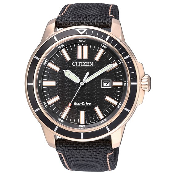 Una delle sfide di Citizen: sviluppare una tecnologia che garantisse il costante funzionamento dell’orologio, in qualsiasi parte al mondo. Nel 1976, inventa il primo orologio analogico al quarzo alimentato a luce che funziona utilizzando esclusivamente la luce come fonte d’energia. Questa tecnologia, ora conosciuta come Eco-Drive, può generare l’energia da qualsiasi sorgente di luce(luce artificiale, luce naturale e persino luce fioca) per continuare a far funzionare gli orologi senza mai sostituire la batteria. Gli orologi Eco-Drive non necessitano della sostituzione della batteria o, nel caso dei movimenti meccanici, delle periodiche ricariche per mantenere costante il funzionamento. Questo tipo di tecnologia è progettata in modo tale che qualsiasi fonte luminosa, indipendentemente dalla sua intensità, genera l’energia necessaria al funzionamento dell’orologio. Uno dei tratti distintivi di Citizen Eco-Drive rispetto alle altre tecnologie per il funzionamento continuo dell’orologio è la sua “riserva di carica”. Gli orologi Eco-Drive, quando completamente carichi, continuano a funzionare per più di 6 mesi, anche al buio completo. CARATTERISTICHE Cassa in acciaio con fondo serrato a vite, cinturino in tessuto tecnico. WR 10 bar DIMENSIONI Diametro cassa 45 mm MOVIMENTO : Eco Drive (a carica luce infinita), con riserva di carica di 6 mesi Cassa 45mm in acciaio placata oro rosa Cinturino in tessuto nero Quadrante nero , con vetro minerale; indici e datario ore 3 Solotempo WR 10 bar Peso 82gr