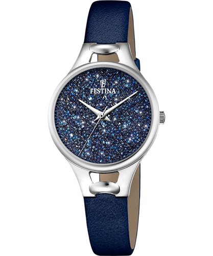 Orologio solo tempo da donna con cassa in acciaio del diametro di 32 Mm. Quadrante blu con cristalli swarovski, cinturino in pelle liscia blu. Resistente all'acqua 5 atmosfere, movimento al quarzo.