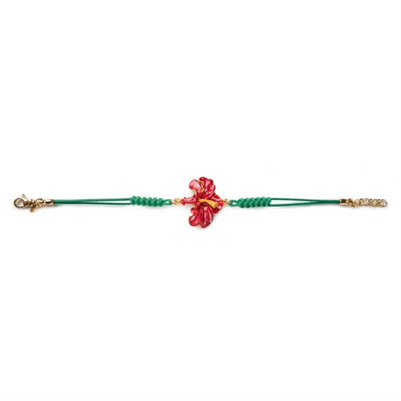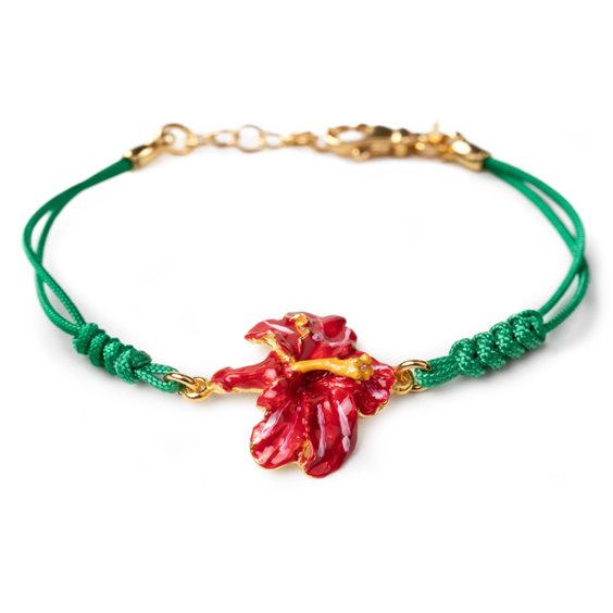 Bracciale in argento 925, placcato oro, smalti e cordino in tessuto annodato a mano anallergico con chiusura estendibile. Il nome Ibiscus deriva dal greco hibiskos che significava “malva”. Ad attribuire il nome alla pianta dai fiori grandi e colorati fu Discoride, uno dei più famosi medici dell’antichità, intorno al I secolo a.C.. Pare infatti che la radice e i petali, grazie alle proprietà officinali e curative, fossero impiegati per curare alcune malattie. Regalare un Ibisco era quindi considerato augurio di buona salute.