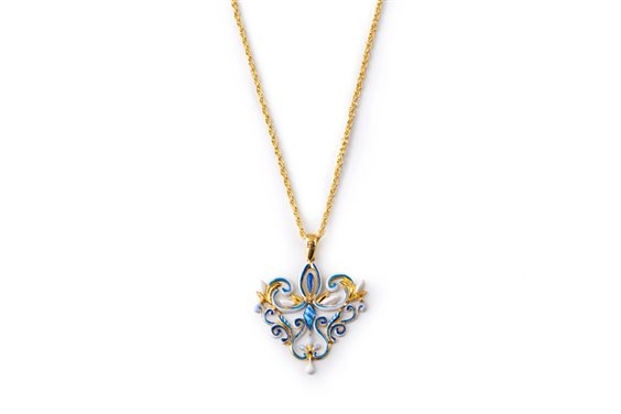 I decori caratteristici delle ceramiche siciliane in questo pendente vivace come la terra a cui si ispira. Collana in argento 925 placcato oro e smalti.