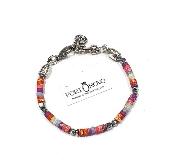 Bracciale Portonovo realizzato con elementi in metallo finitura argentata e pietre naturali. Chiusura con moschettone e charm Portonovo. Misura regolabile da 18 a 20 cm.