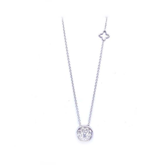 Collana Recarlo collezione Marilyn, punto luce in oro bianco 18 kt Gr 3,8 con 10 diamanti a pavè, 9 piccoli per un tot di 0,21 e uno centrale da 0,185 punti colore E- SI, certificato di garanzia e microfilmatura del certificato del diamante e assicurazione per 2 anni. Catena rolò cm 44 con possibilità di accorciamento grazie a due anellini a cm 41 e 38. Made in Italy