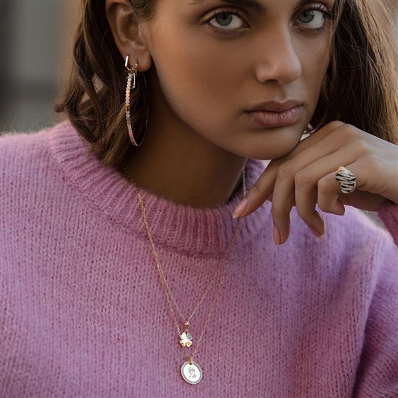 Ciondolo con moschettone e soggetto quadrifoglio con zirconi. Soggetto: Quadrifoglio. Finitura disponibile: Placcatura oro rosa 18kt Materiale: Argento 925. Grandezza ciondolo: 1,2 cm.