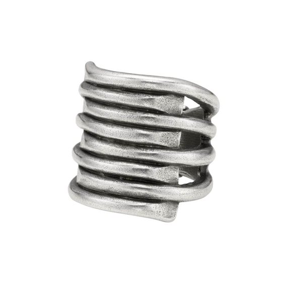 Anello in metallo argentato, composto da un’unica fascia costituita da diversi giri di metallo argentato, tutti saldati tra loro. Come tutti i gioielli del marchio, è stato realizzato a mano in Spagna.