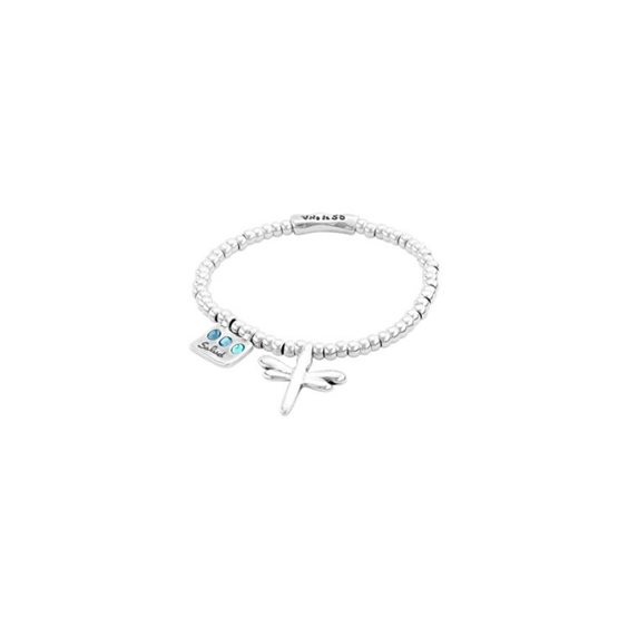 Semplice bracciale elastico composto da molteplici elementi circolari in metallo bagnato nell?argento e rifinito con due charm in argento, uno a forma di libellula e l?altro con il messaggio Salud e tre cristalli di Swarovski dai toni azzurri. Un gioiello che si illumina per ciò che è realmente importante. Un design di UNOde50, realizzato in Spagna secondo un processo interamente artigianale.