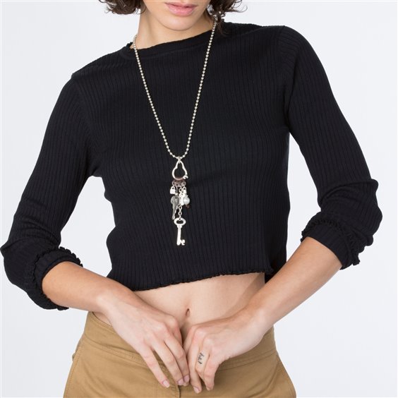 Collana a palline in zama argentata con pendente con più elementi in zama argentata e pelle marrone.