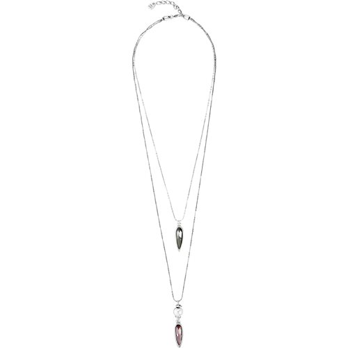 Collana lunga con due giri disposti a diverse altezze, con catena bagnata nell’argento e pendenti a forma di petalo che presentano al loro interno cristalli SWAROVSKI® nei colori grigio e rosa. Inoltre vi è inserita una perla che conferisce un tono elegante al pezzo. Un gioiello senza tempo di stile boho chic realizzato a mano in Spagna da UNOde50 e in modo totalmente artigianale.