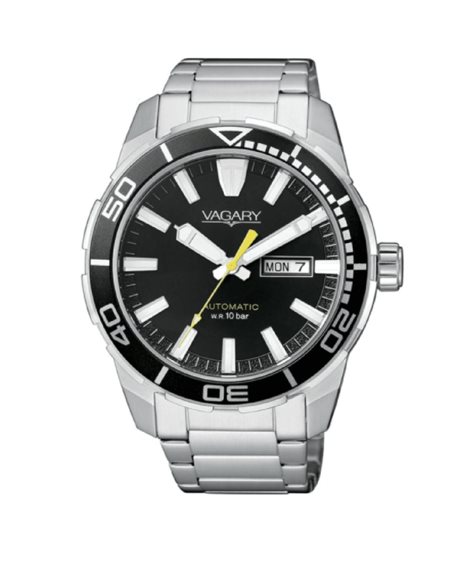Orologio automatico della collezione Vagary G. Matic 101 da uomo. Colore della cassa: argento; colore del quadrante: nero; colore del bracciale: argento. Cassa di diametro 43 mm in acciaio inossidabile 316L e quadrante con datario; fondo con oblò trasparente. Vetro minerale. Bracciale in acciaio inossidabile 316L con chiusura deployante. Movimento meccanico a ricarica automatica CAL 8200 con rotore personalizzato, 21 rubini, 21600 alternanze e 40 ore di riserva di carica. Classificazione di impermeabilità (WR) 10 bar: adatto al nuoto, allo yachting, allo snorkeling, alla nautica. Peso 159 gr.